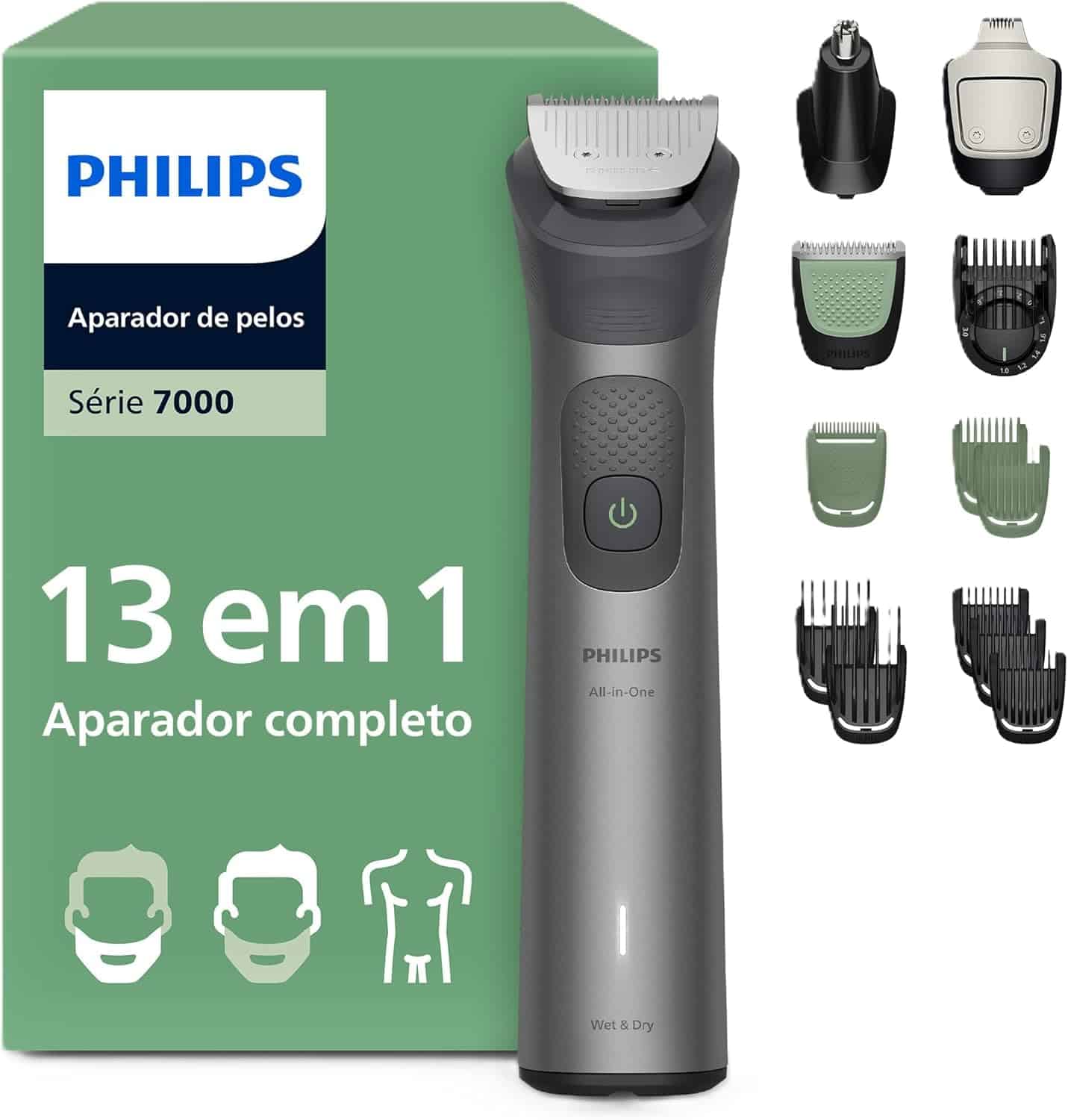 O Multigroom 13 em 1 Série 7000 da Philips, um aparador premium para rosto, cabelo e corpo. Com um design premium, você conta com lâminas autoafiáveis que não precisam de óleo e tecnologia BeardSense para desempenho preciso até mesmo em barbas densas.